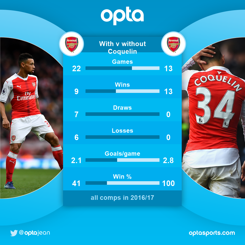 โดยใน 13 เกมที่ลงเล่นโดยไม่มีกองกลางรายนี้ ปืนใหญ่ สามารถเก็บชัยชนะได้ทั้งหมด ขณะที่เมื่อมีเขาอยู่ภายในทีมด้วย อาร์เซนอล มีความเป็นไปได้ในการชนะอยู่แค่ 41% เท่านั้น
